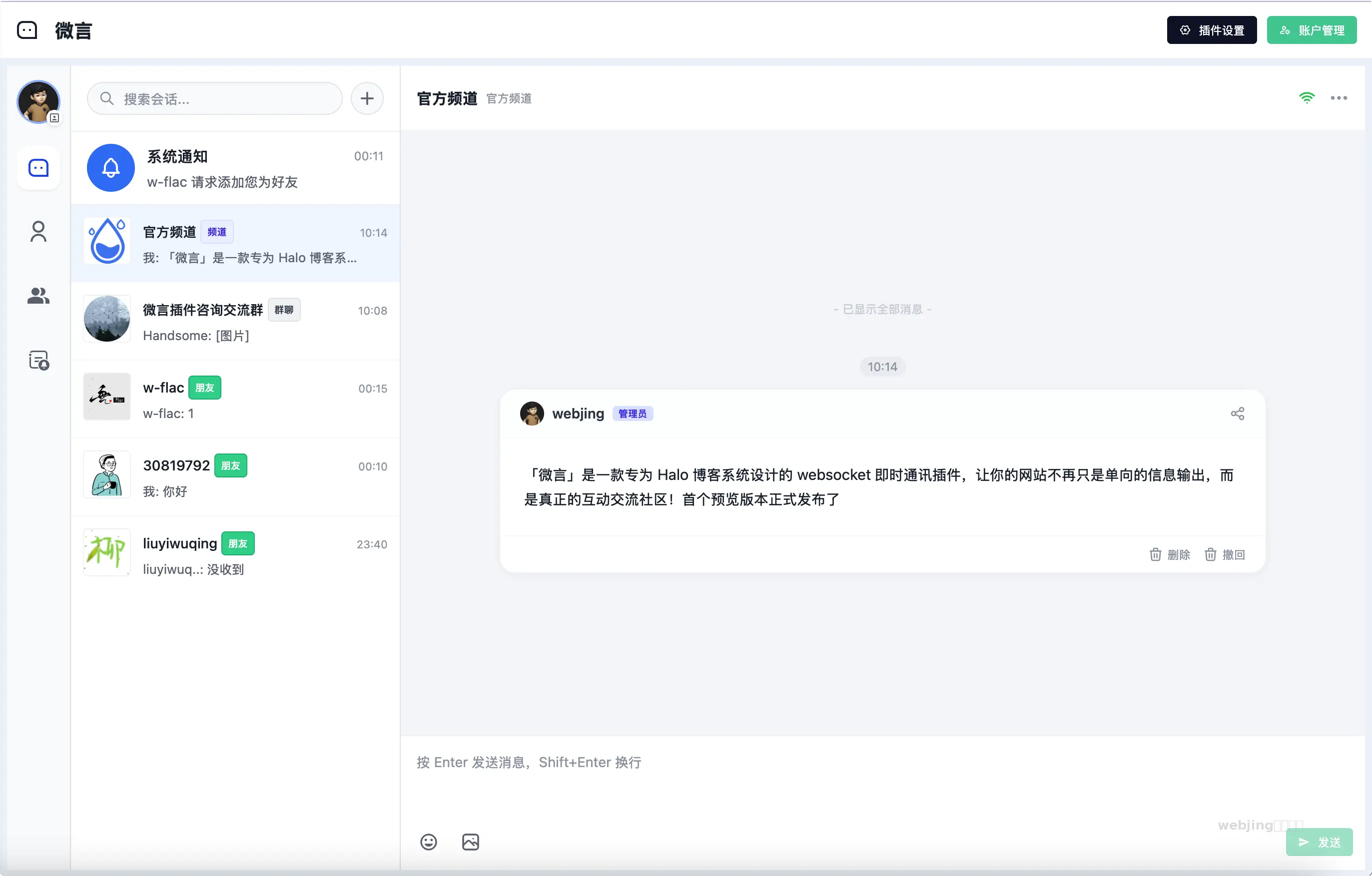 #实时通讯 #WebSocket #消息推送基于 WebSocket 的实时消息推送系统,支持私聊、群聊和频道多种通讯场景,消息秒达零延迟